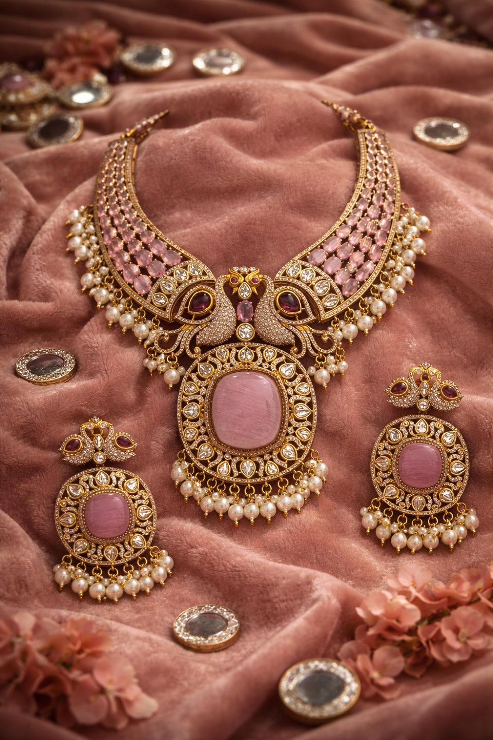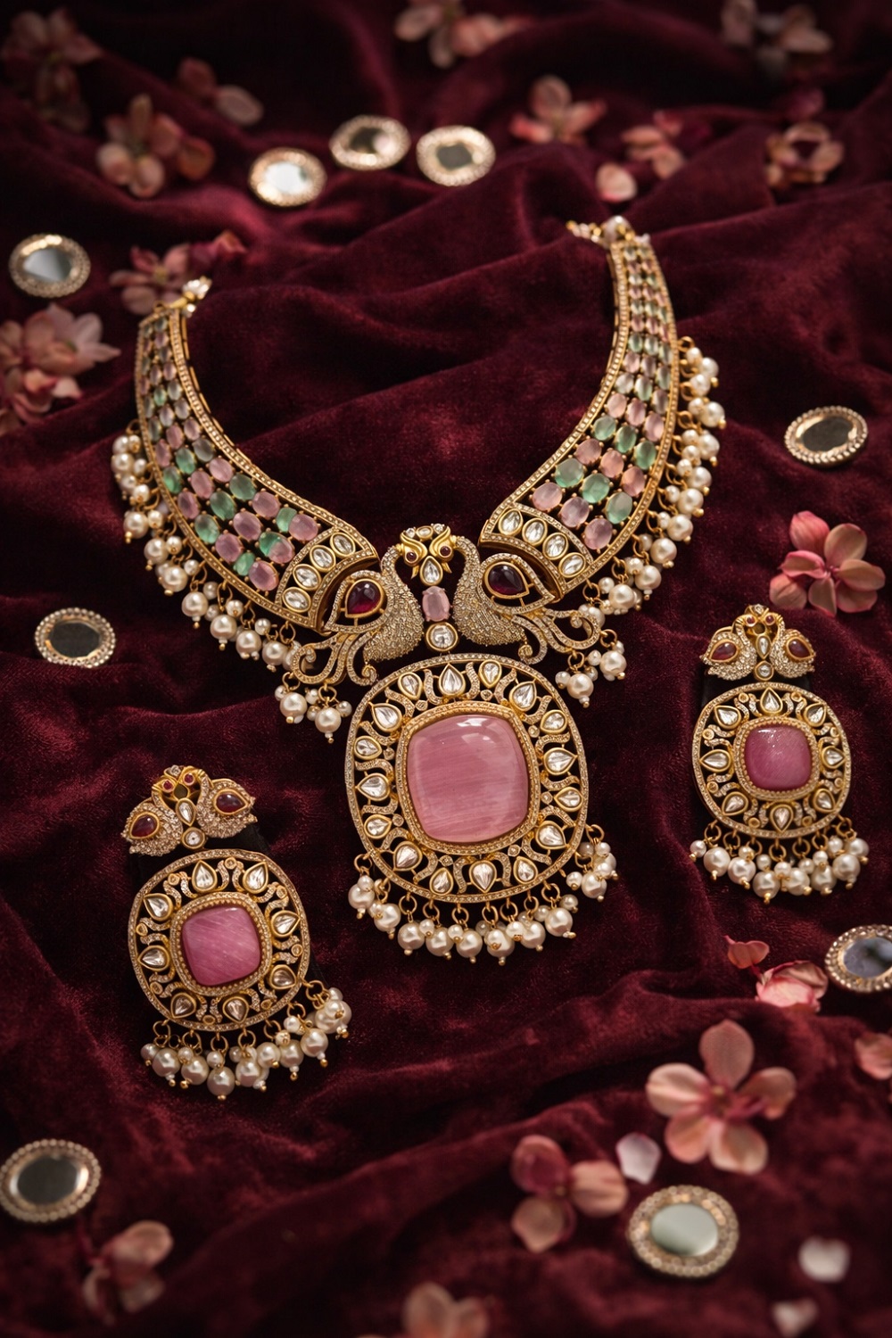 This luxury imitation jewellery set is perfect for brides, bridesmaids, and fashion-forward women who want a celebrity-inspired royal look without the heavy price tag. Style it with sarees, lehengas, Anarkalis, or Indo-Western outfits to create an unforgettable impression.