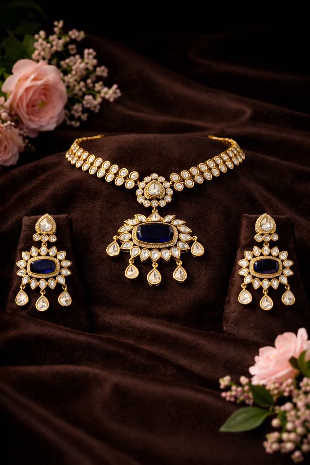 Crafted on a high-quality brass base with premium finishing, the necklace ensures durability, comfort, and long-lasting shine. The compact short-necklace design makes it perfect for those who prefer a subtle yet luxurious statement, ideal for weddings, festive celebrations, parties, and traditional occasions.