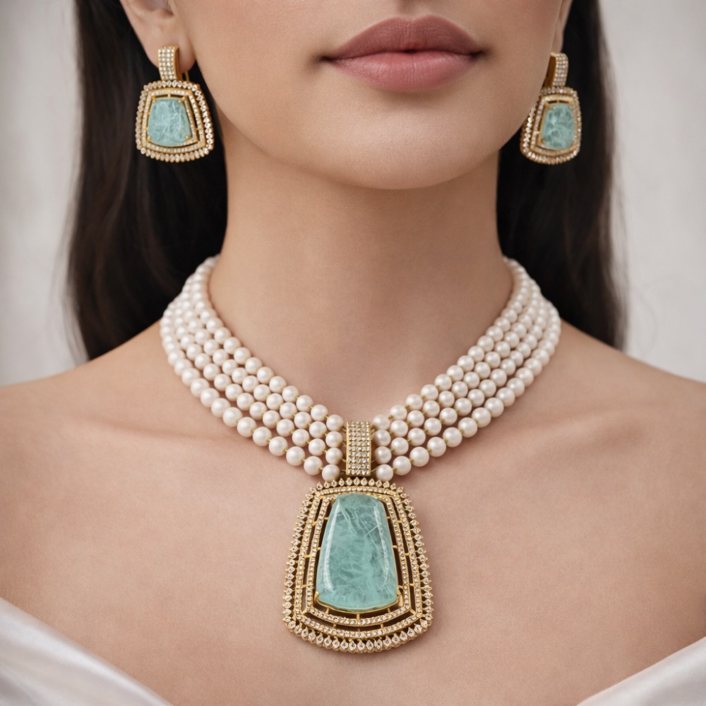 Elevate your elegance with this luxury multi-layer pearl necklace set, crafted to give a rich and royal look. The necklace features four strands of high-lustre pearls, beautifully finished with a statement mint-green stone pendant, surrounded by premium gold-tone detailing and sparkling stones.