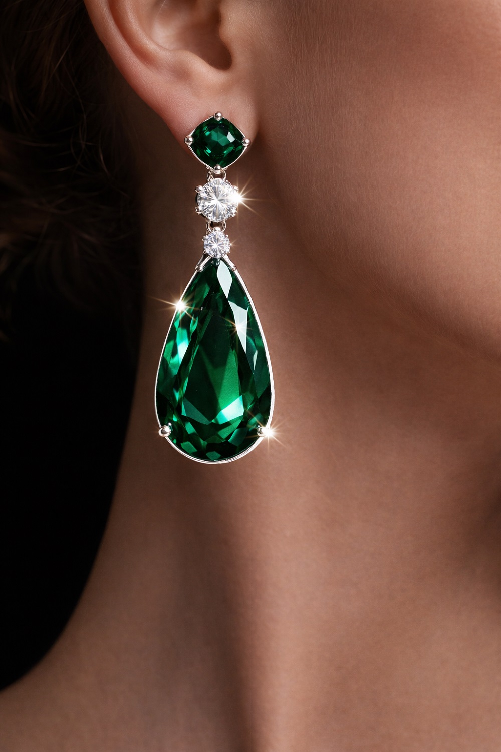 Premium emerald green pear-shaped drops High brilliance diamond setting Statement luxury design Matching elegant drop earrings included Perfect for bridal & grand occasion wear