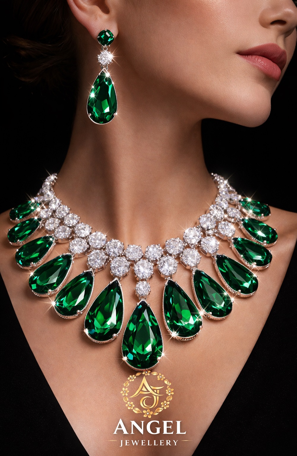 Experience timeless luxury with our Emerald Royale Diamond Statement Necklace Set, exclusively crafted by Angel Jewellery. This breathtaking masterpiece features bold pear-shaped emerald green drops gracefully suspended beneath brilliantly cut, high-shine diamonds, creating a perfect balance of royalty and elegance. Designed for grand occasions, weddings, receptions, and festive celebrations, this statement set instantly enhances your look with its rich emerald brilliance and dazzling diamond sparkle.