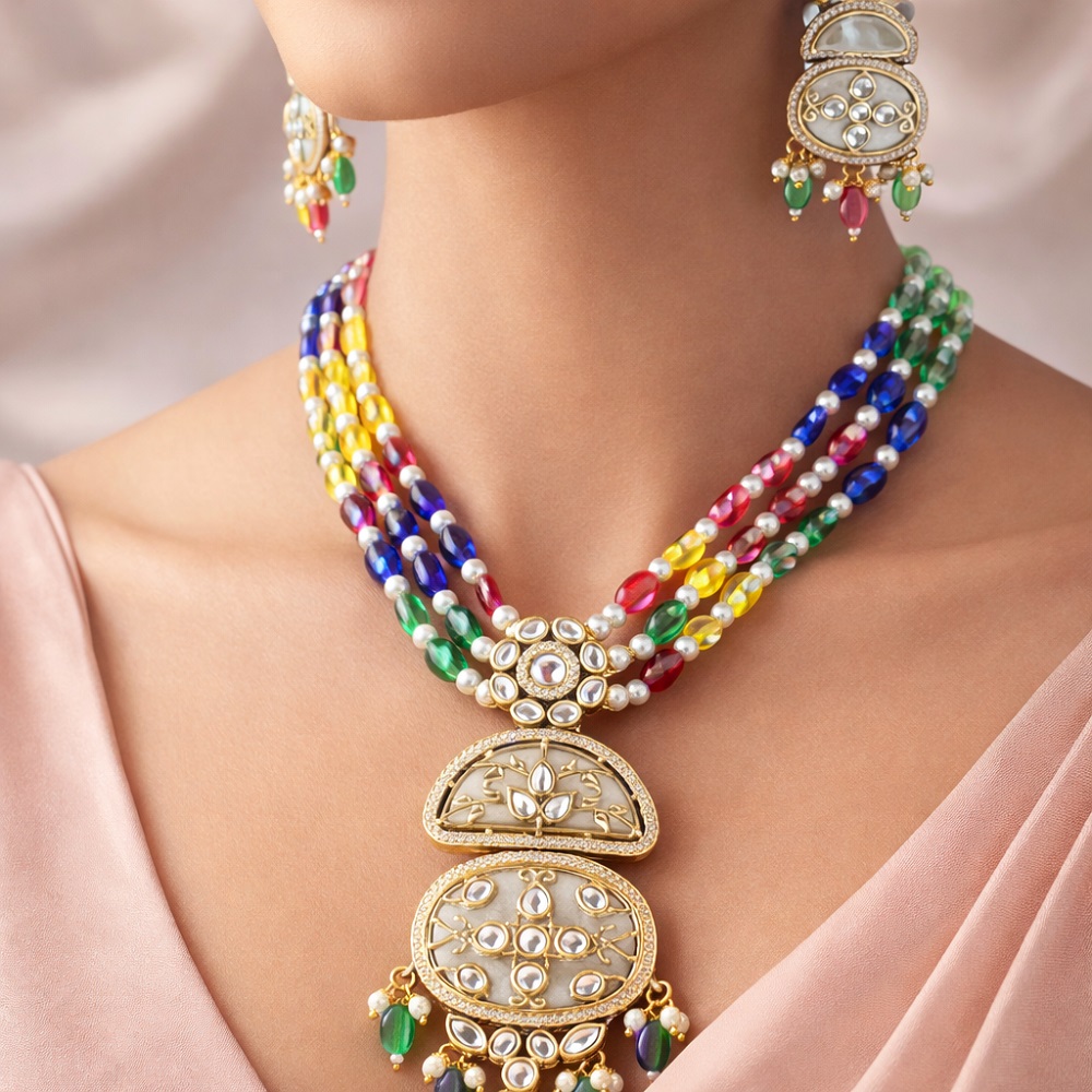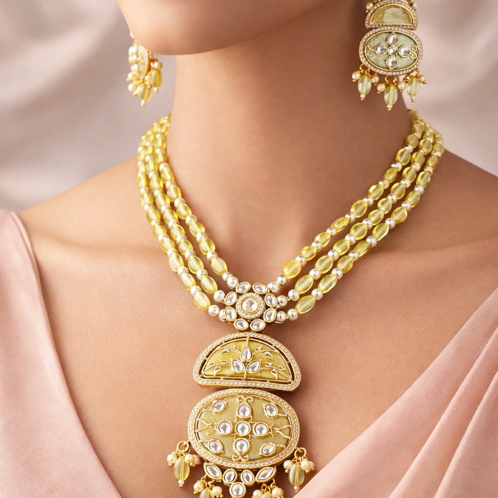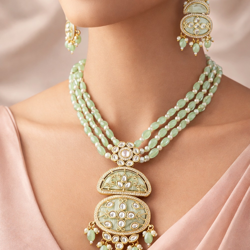 Enhance your elegance with this handcrafted MOP Polki long necklace, beautifully paired with matching MOP earrings and highlighted with sparkling moissanite stones. Designed for women who love royal, timeless jewellery, this piece reflects fine craftsmanship and luxurious detailing.