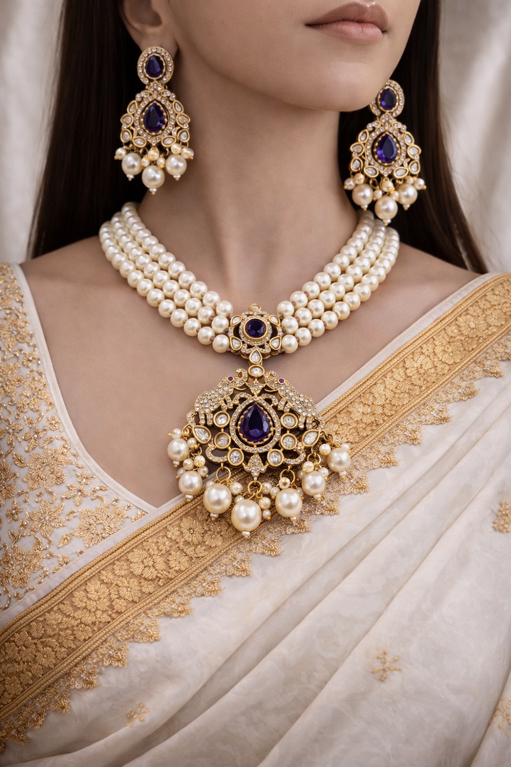 Crafted using high-quality metal with durable premium polish, this jewellery set delivers long-lasting shine and a real-jewellery finish. The pearls are carefully selected for their smooth texture and natural glow, while the moissanite stones enhance the design with their exceptional sparkle. Despite its grand appearance, the necklace is lightweight and comfortable, making it ideal for long hours of wear.