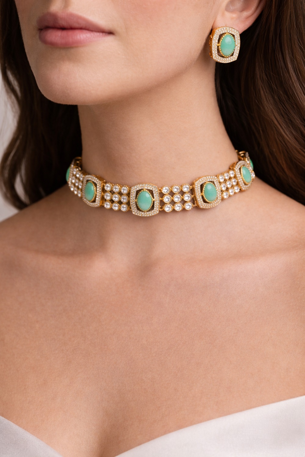 The intricate craftsmanship and premium polish create a luxurious look that sits gracefully on the neckline, making it perfect for weddings, festive occasions, parties, and traditional celebrations. Paired with beautifully designed matching stud earrings, this set completes your look with effortless sophistication.