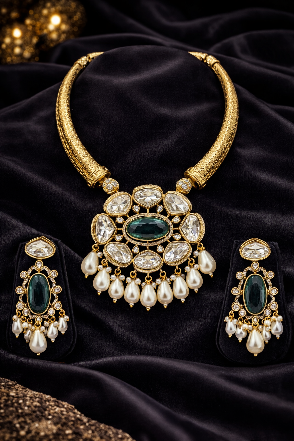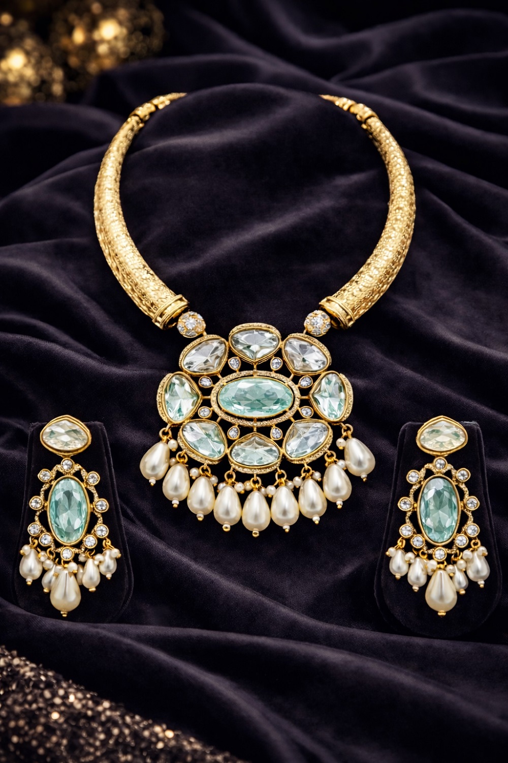 At Angel’s Imitation Jewellery, we specialize in highly premium imitation jewellery that reflects class, grace, and exclusivity. This semi-divine brass hasli with Monalisa and moissanite detailing is a timeless piece that adds calm elegance and royal charm to your jewellery collection.
