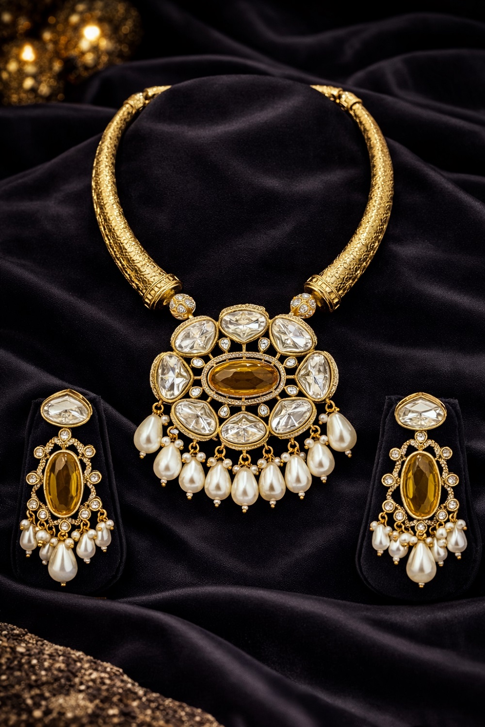 Crafted using high-quality brass and finished with superior polish, this hasli set offers durability, comfort, and long-lasting shine. The elegant pendant earrings perfectly balance the look, making it a complete statement jewellery set. Its versatile design makes it suitable for weddings, festive occasions, traditional ceremonies, temple visits, cultural events, and elegant evening functions.
