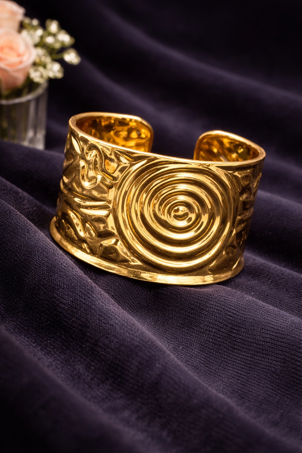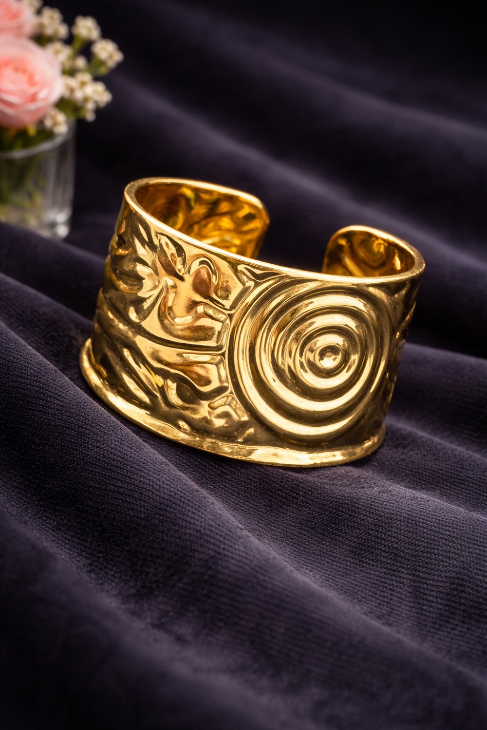 Elevate your style with this premium handcrafted brass kada, designed for women who love bold, elegant, and timeless jewelry. Crafted from high-quality brass, this luxurious cuff bracelet features a rich gold finish with an artistic hammered texture and sculpted spiral detailing, giving it a distinctive statement look. The wide cuff design reflects light beautifully, creating a high-shine premium appeal that instantly enhances any outfit.