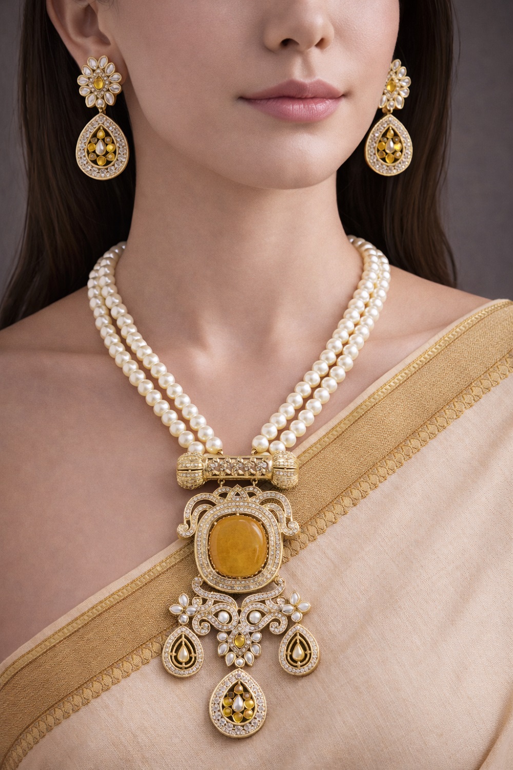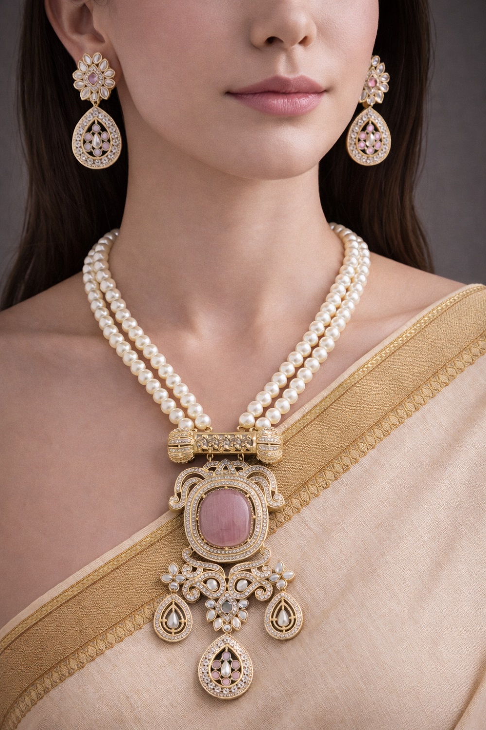Enhance your graceful elegance with this premium long pearl (moti) necklace, beautifully designed by Angel’s Imitation Jewellery for women who love timeless luxury. This stunning necklace features high-quality long pearls, a broad statement doublet stone pendant, and perfectly matching designer earrings, creating a rich and sophisticated look. The pearls are carefully selected for their smooth texture, uniform shine, and premium finish, giving the necklace a refined and elegant appeal.