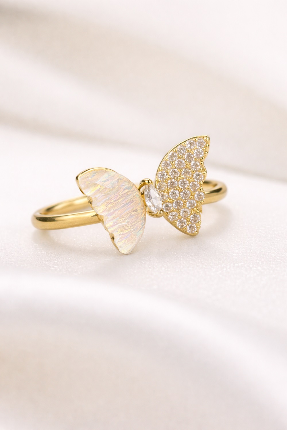 Bring grace and charm to your jewellery collection with this beautifully designed butterfly-inspired crystal ring. Crafted with a delicate balance of elegance and modern style, this ring features a unique dual-wing design that symbolizes transformation, beauty, and femininity. One wing showcases a soft iridescent finish that reflects subtle rainbow tones, while the other wing sparkles with carefully set crystal stones, creating a perfect contrast between minimal sophistication and eye-catching shine.