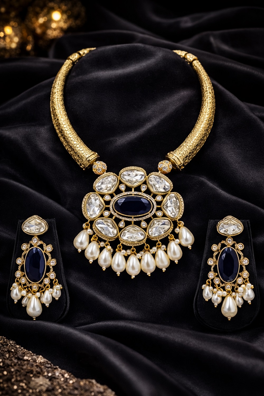 At Angel’s Imitation Jewellery, we specialize in highly premium imitation jewellery that reflects class, grace, and exclusivity. This semi-divine brass hasli with Monalisa and moissanite detailing is a timeless piece that adds calm elegance and royal charm to your jewellery collection.