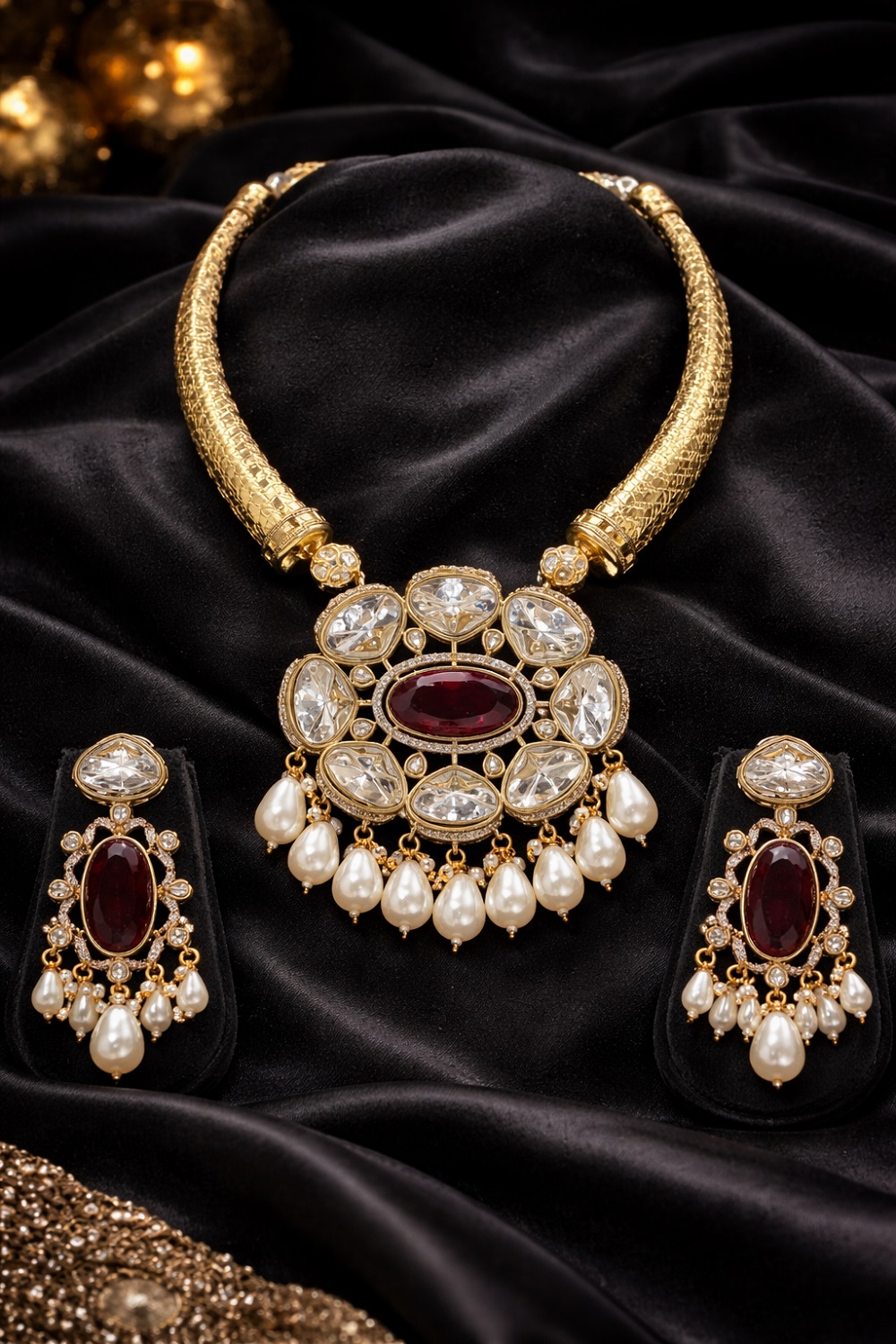 Crafted using high-quality brass and finished with superior polish, this hasli set offers durability, comfort, and long-lasting shine. The elegant pendant earrings perfectly balance the look, making it a complete statement jewellery set. Its versatile design makes it suitable for weddings, festive occasions, traditional ceremonies, temple visits, cultural events, and elegant evening functions.